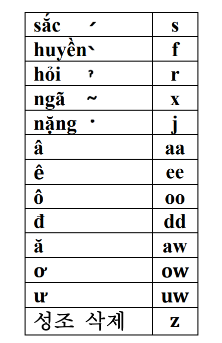 ă, ư, ơ 는 해당 알파벳과 'w'를 함께 입력합니다.